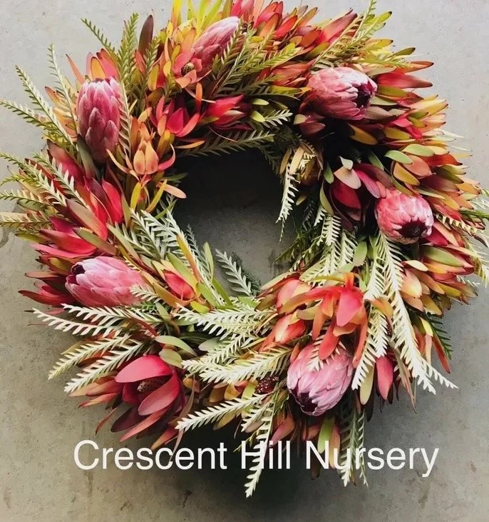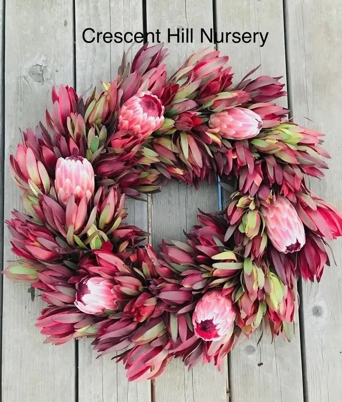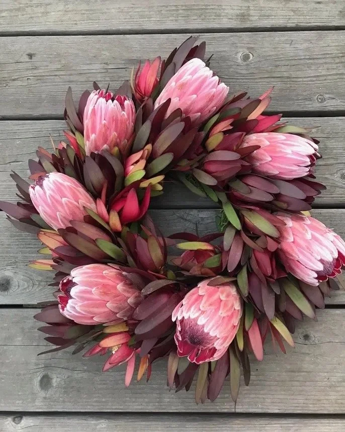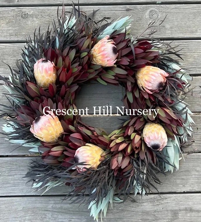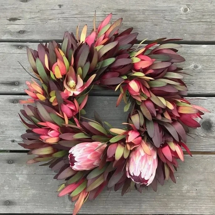 Grevillea/Leucadendron/Silver Tree Mixed wreath with 6 flowers. Final size is 18-24 inches.